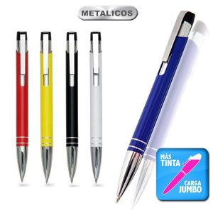 Original bolígrafo de mecanismo pulsador en elegante diseño bicolor. Con cuerpo troquelado en aluminio de suave acabado en variados colores. Original clip curvado, anillas y punta en plateado. De ...