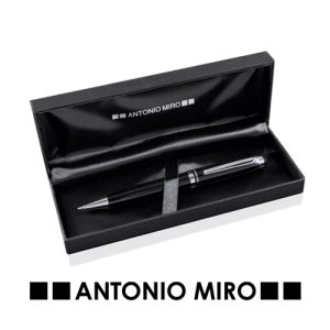 Bolígrafo de Antonio Miró en elegante diseño bicolor y suave cuerpo metálico en sobrio color negro. Con logotipo de la marca encima de la anilla, clip y punta en ...