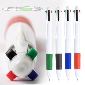 Bolígrafo 4 en 1 de mecanismo pulsador retráctil, de clásico diseño y cuerpo de suave acabado sólido en color blanco. Suave empuñadura a juego en vivos colores. De 4 ...