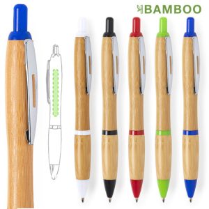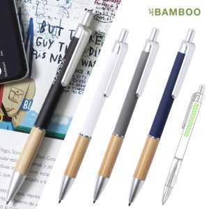 Bolígrafo con mecanismo pulsador de línea nature, con cuerpo en bambú y detalles en variada gama de colores. Con original clip metálico troquelado y cómoda empuñadura de bambú. Tinta ...