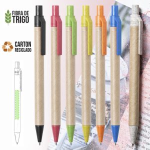 Bolígrafo de mecanismo pulsador con cuerpo en cartón reciclado. Clip, punta y pulsador en caña de trigo. En tinta azul y con distintivo Wheat Straw en la parte superior ...