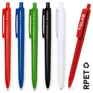 Bolígrafo fabricado en RPET. Clip con amplia zona de marcaje, de mecanismo pulsador y en tinta azul. Distintivo RPET en la parte superior del bolígrafo.Elaborado a partir de plástico ...