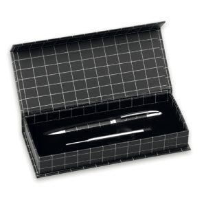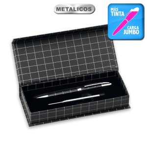 Elegante bolígrafo de mecanismo giratorio en sobrio diseño bicolor. De cuerpo metálico en suave acabado con accesorios en colores plateados. Presentado en elegante estuche individual en color negro con ...