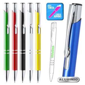 Bolígrafo con cuerpo en aluminio de acabado sólido brillante. Detalles en cromado y original muesca en cuerpo. De mecanismo pulsador, con cartucho jumbo y tinta azul. Carga Jumbo