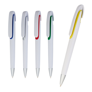 Elegante bolígrafo con mecanismo pulsador. Con cuerpo acabado en color blanco brillo y empuñadura en variada gama colores. Fabricado en resistente ABS acabado brillo. Con carga jumbo y tinta ...