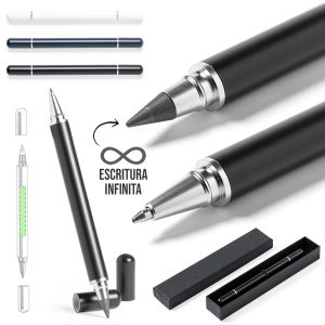 Bolígrafo lápiz eterno 2 en 1, fabricado en resistente metal de acabado brillo. Con cierre de capucha, incluye bolígrafo en un extremo (carga jumbo y tinta azul), y lápiz ...