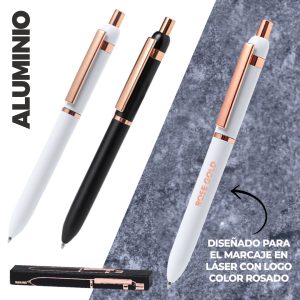 Elegante bolígrafo especialmente diseñado para el marcaje en láser con logotipo en color rosado. De mecanismo pulsador, clip metálico y accesorios en acabado cobre, con detalles plásticos en acabado ...