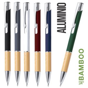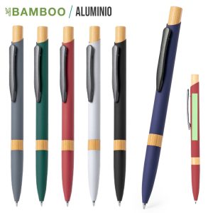 Elegante bolígrafo de aluminio con mecanismo pulsador. Cuerpo en resistente aluminio de acabado goma mate y con detalles en bambú, con caña en una amplia gama de distintivos colores. ...