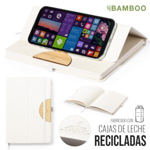 Libreta de línea nature convertible en soporte para smartphone y fabricada con cartones de leche reciclados. Tapas duras, con detalle en bambú en la portada y elástico de sujeción ...