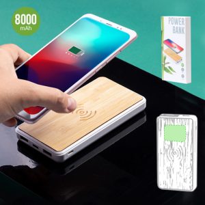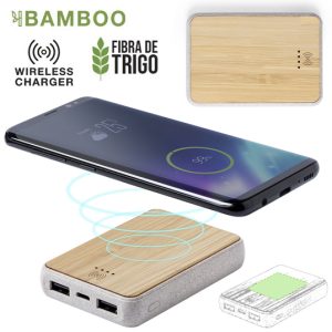 Batería auxiliar externa de línea nature, con cargador inalámbrico integrado y carcasa en madera de bambú. 8.000 mAh de capacidad de carga e indicador de estado de carga. Salida ...