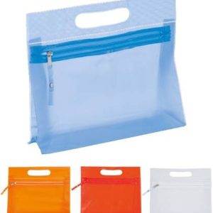 Neceser multiusos en resistente PVC translúcido de variada gama en vivos colores. Con resistente asa troquelada y cierre de cremallera a juego, con cinta en tirador para fácil apertura.