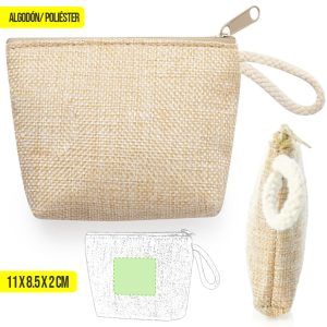 Neceser multiusos en combinación de yute laminado y algodón natural. Con cierre de cremallera y tirador en yute a juego. Parte central de algodón en variados colores.