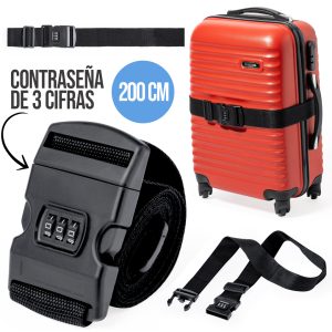 Cinta para maletas ajustable fabricada en resistente poliéster. Con cierre de hebilla ajustable y contraseña de 3 cifras. En discreto color negro y de 200cm de largo. Presentada en ...