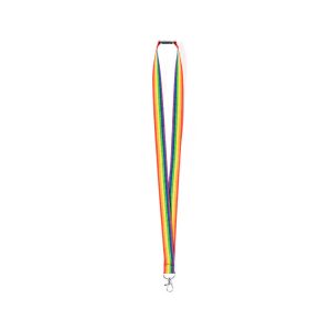 Lanyard Rainbow multicolor, fabricado en suave poliéster. Con mosquetón metálico giratorio y accesorio de seguridad en el cuello. Todo un orgullo de lanyard. Cierre Seguridad