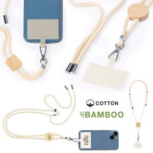 Original lanyard con accesorio para smartphone. Fabricado en resistente algodón, con accesorio de bambú para marcaje. Accesorio de transporte para situar entre la funda y el smartphone y mosquetón ...