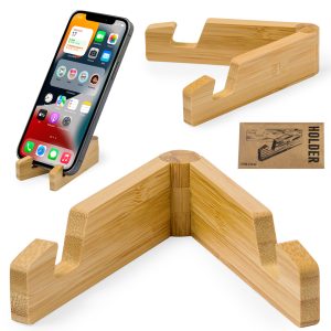 Soporte plegable para dispositivo móvil fabricado en resistente bambú. Con patas ajustables y presentado individualmente en bolsa de papel reciclado. Materiales como el bambú fomentan la utilización de ...