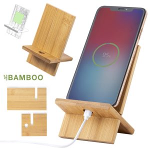 Soporte de línea nature para dispositivos móviles (smartphones y tablets). Fabricado en resistente bambú de acabado lacado, con ranura/soporte en ambas caras.
