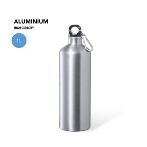 Bidón de 1 l de capacidad, fabricado en aluminio de acabado brillo. Tapón a rosca en negro, con anilla y mosquetón de transporte. Libre de BPA y presentado en ...