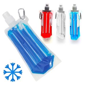 Bidón enfriador de 400ml de capacidad con cuerpo acabado en PET transparente y líquido refrigerante en vivos colores. Con tapón de seguridad a rosca y mosquetón metálico de transporte. ...