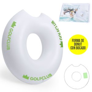 Original colchoneta inflable en PVC de tamaño maxi y en forma de donut con bocado. Presentada con plegado especial para fácil impresión. Plegado Especial para Impresión