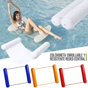Original colchoneta en resistente PVC. Incluye una cómoda almohada para la cabeza, con diseño bitono, en colores transparente y blanco. Incluye una resistente redecilla central en poliéster de color ...