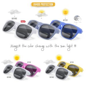 Gafas de sol mágicas con protección UV400. Según sea la intensidad de la luz solar, la montura cambia progresivamente de color. Con montura mate en divertidos colores y lentes ...