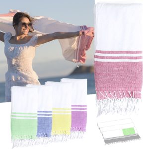 Suave pareo de toalla de 180g/m2 en combinación de algodón y poliéster. Disponible en variada gama de colores en tono bicolor. Presentado individualmente en bolsa.