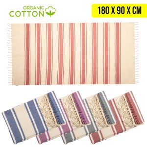 Pareo toalla 2 en 1 en algodón orgánico de 110g/m2. Tamaño 180 x 90 cm y disponible en variada gama de colores combinados. Distintivo organic en etiqueta.