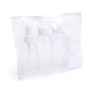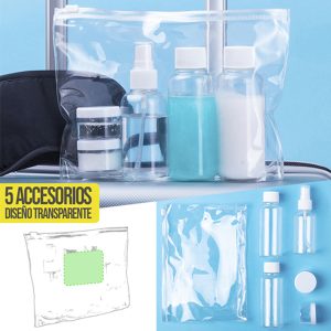 Set neceser de viaje de 5 accesorios en diseño transparente. Incluye dos botes para gel y champú con tapón a rosca, perfumador y dos tarritos para crema. Presentado en ...