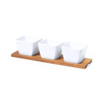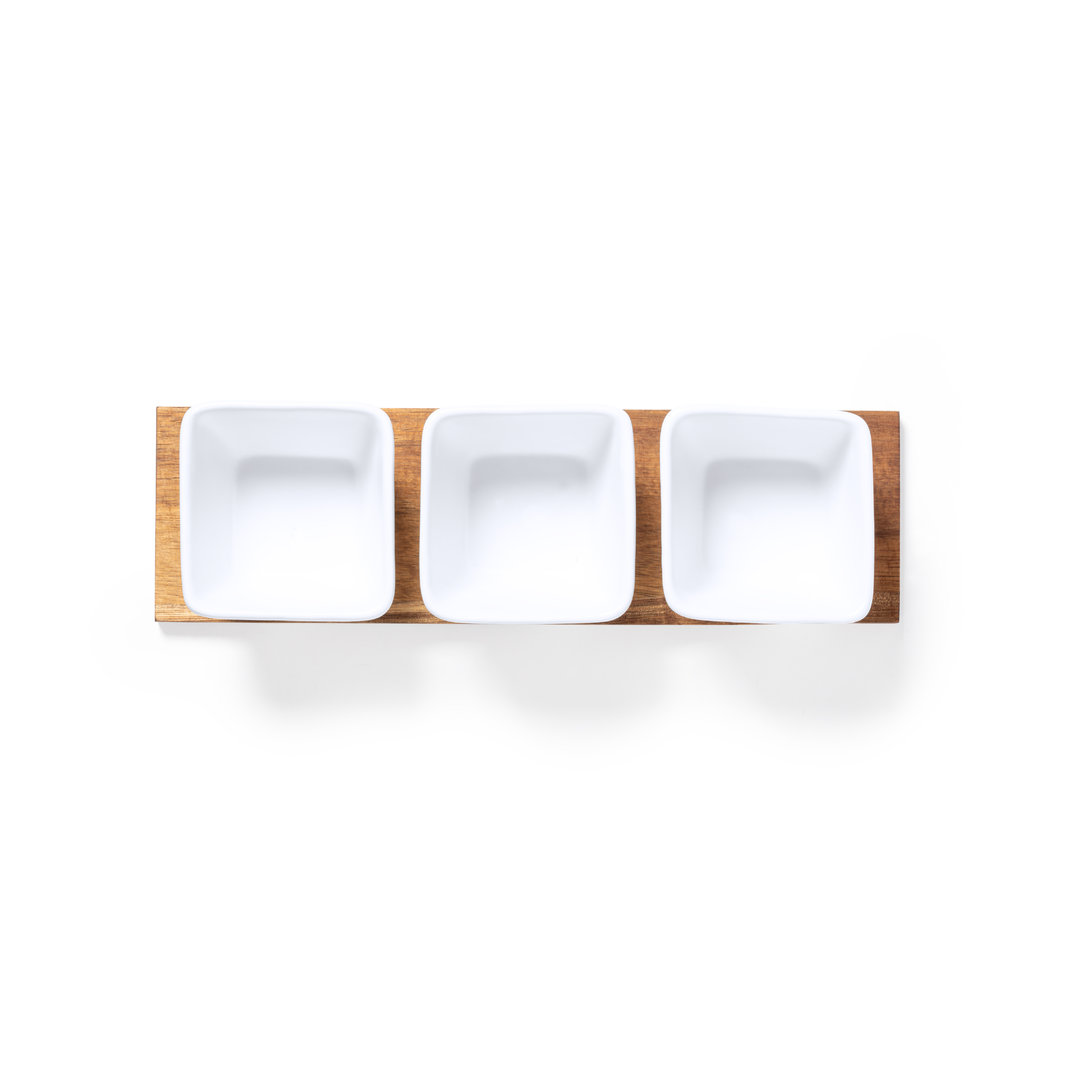 Bandeja de entremeses con 3 cuencos en blanco y fabricados en cerámica. Incluye base en madera natural, troquelada para encajar los cuencos. Presentación en caja individual de diseño kraft. 3 Piezas
