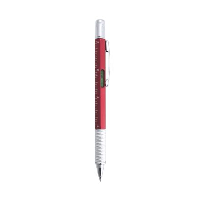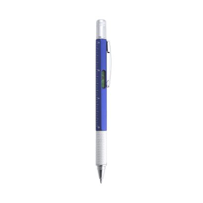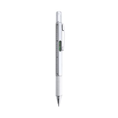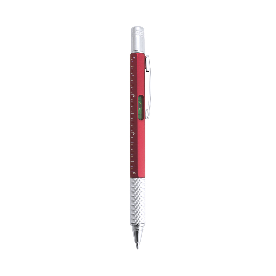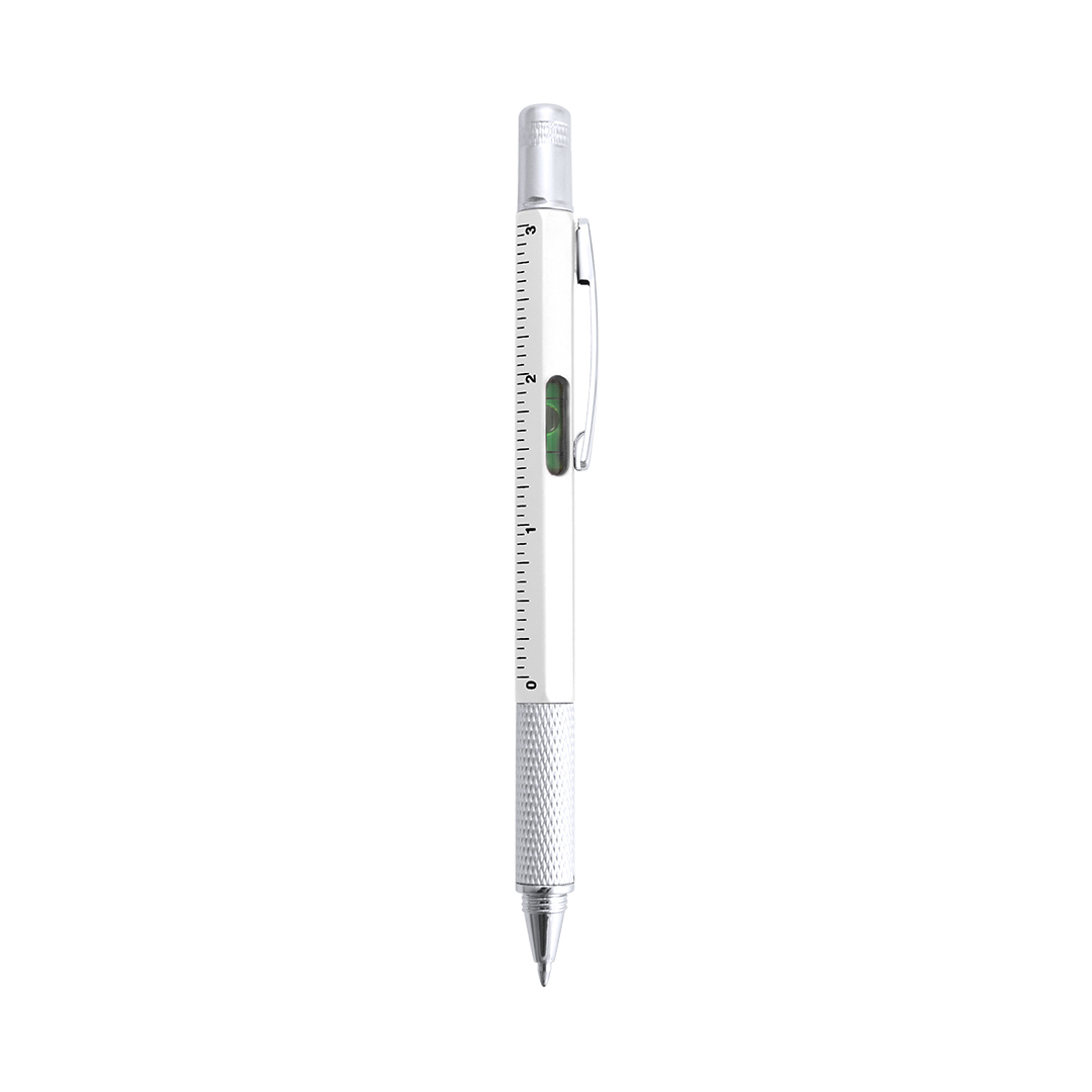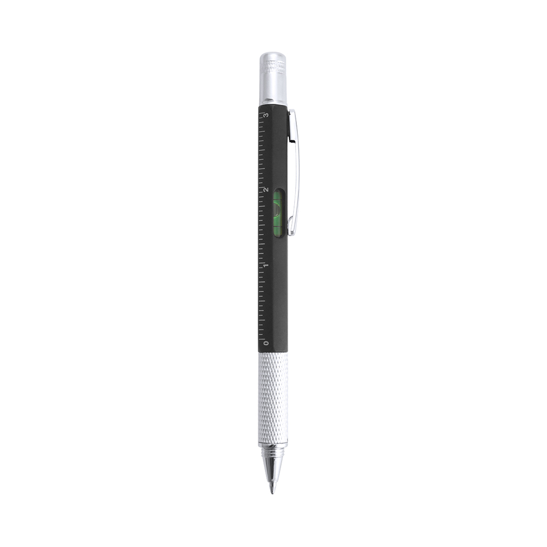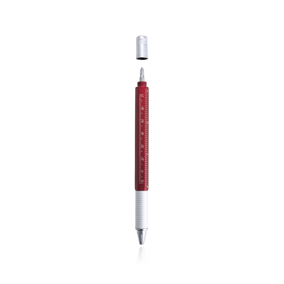 Bolígrafo multiherramienta 4 en 1 de mecanismo giratorio, en variados colores y con suave empuñadura. Con nivel integrado en cuerpo, regla con sistema métrico en centímetros/pulgadas y destornillador de doble cabeza -plana y de estrella-. Con clip metálico y tinta azul. 1 Accesorio. 5 Funciones
