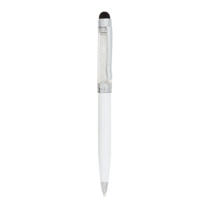 Original bolígrafo puntero de mecanismo giratorio con divertido líquido burbujeante en parte superior. Cuerpo metálico en suave acabado de vivos colores y accesorios en color plateado brillante. En tinta azul.