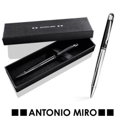Bolígrafo puntero de Antonio Miró de mecanismo giratorio con suave cuerpo metálico, de elegante combinación de colores en plateado y negro. Clip y punta de diseño a juego. Presentado en estuche individual negro con logotipo de la marca. Tinta azul.