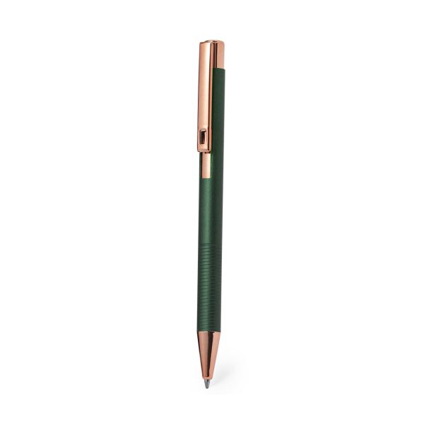 Excelente bolígrafo de aluminio con mecanismo pulsador. Cuerpo en resistente aluminio de acabado mate con elementos decorativos de elegante acabado color cobre, con la caña en una amplia gama de distintivos colores. Clip metálico, con pulsador retráctil de tinta azul y carga jumbo. Presentado en una bolsa individual reciclada. Carga Jumbo