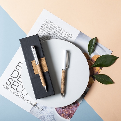Bolígrafo de línea nature en combinación de corcho natural y metal. Con original clip metálico de acabado cromado, a juego con la punta y la anilla. Parte superior en color blanco, de mecanismo giratorio y con tinta azul. Presentado en caja individual de diseño eco.