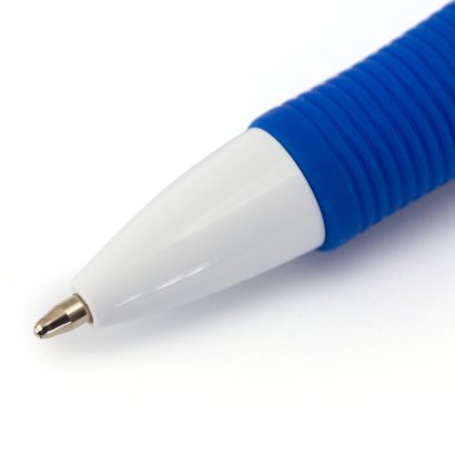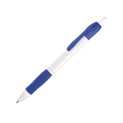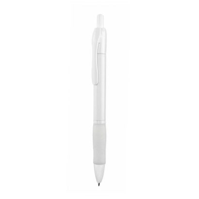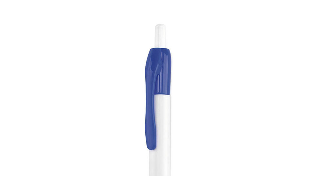 Clásico bolígrafo con mecanismo de pulsador, de atrevido diseño y cuerpo de color blanco sólido en suave acabado. Con cómoda empuñadura y clip a juego. Tinta azul.