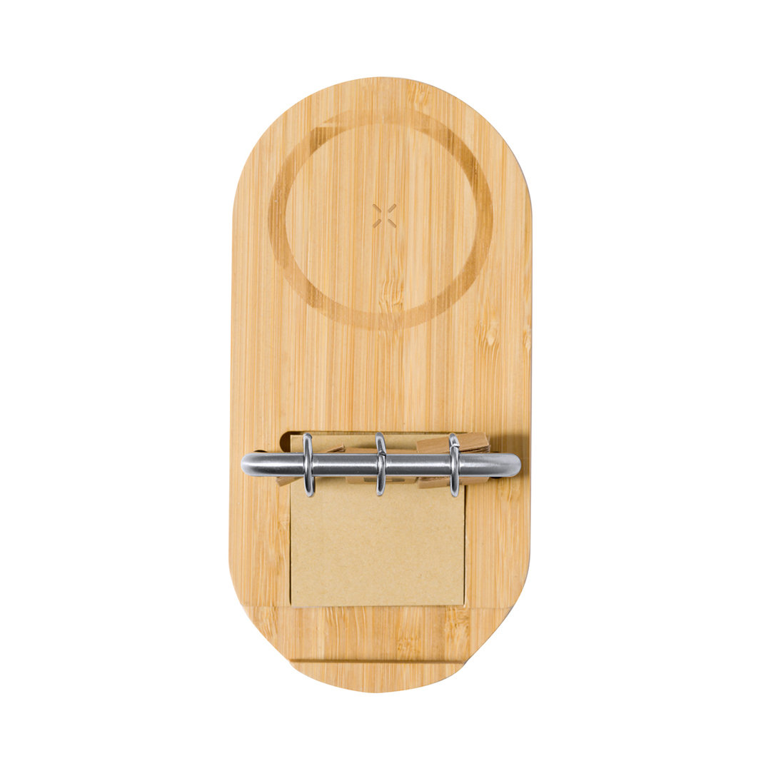 Cargador multifunción inalámbrico 15W fabricado en bambú. Incluye soporte para smartphone y calendario perpetuo, además de un bloc con 50 notas adhesivas acabado kraft de 4,5×4,5 cm. Salida USB y entrada y salida Tipo C, permitiendo cargar de manera simultánea hasta 3 dispositivos (1 mediante carga inalámbrica, 1 mediante cable Tipo C y 1 por cable USB). Compatible con dispositivos equipados con tecnología de carga inalámbrica. Amplia superficie de marcaje y presentado en caja individual de diseño kraft. Materiales como el bambú fomentan la utilización de materias primas naturales, reduciendo las emisiones contaminantes. Proviene de una planta de gran resistencia y versatilidad, con crecimiento y regeneración rápidos, siendo una excelente alternativa al uso de madera tradicional. Fabricado conforme a los estándares RoHS y en cumplimiento con los siguientes requisitos de seguridad: Sistema de protección contra sobrecalentamiento. Sistema de protección contra sobrecarga. Sistema de bloqueo para evitar cortocircuitos. Inalámbrico 15W. 50 Notas Adhesivas 4,5 x 4,5 cm. Salida USB. Salida y Entrada Tipo C
