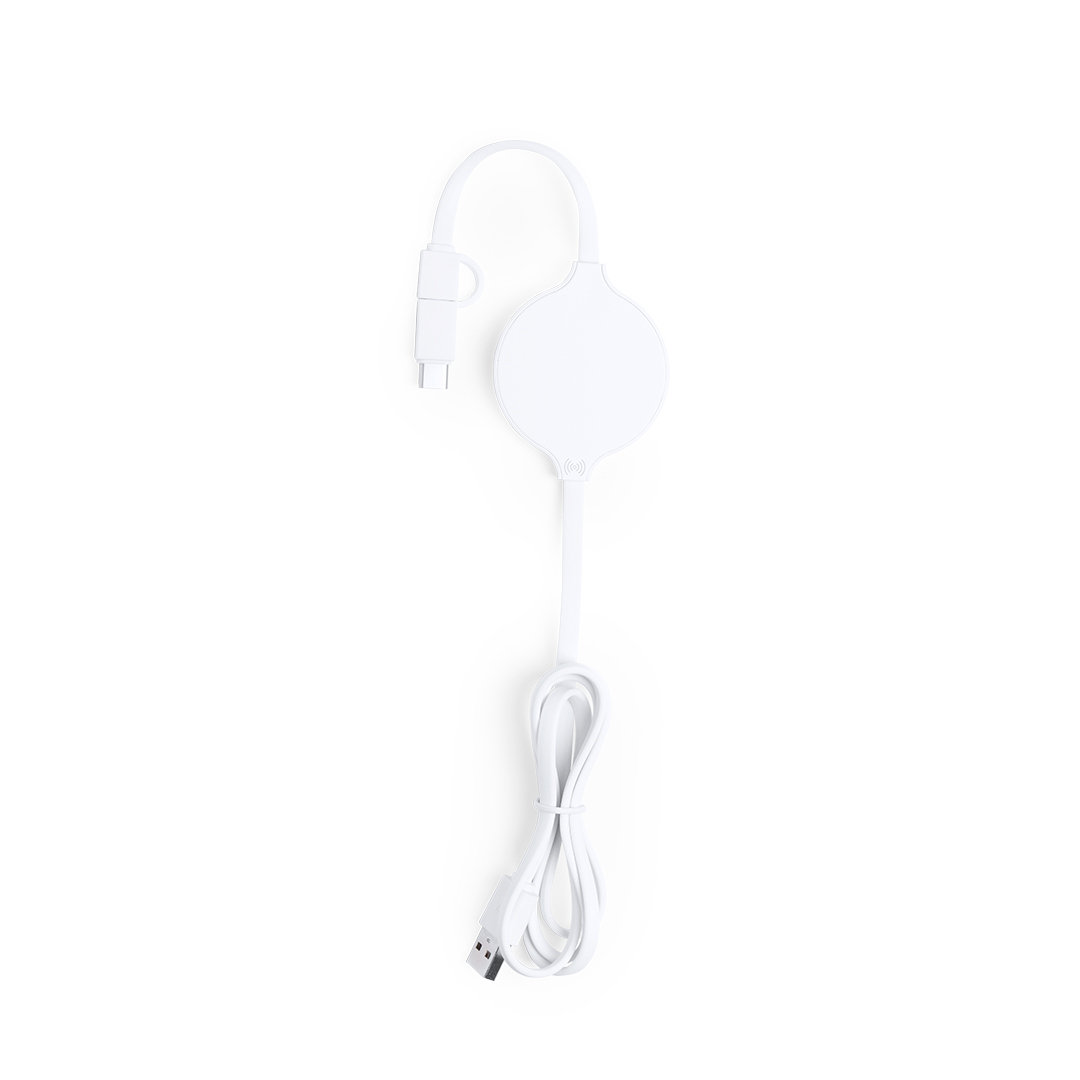 Cargador inalámbrico de diseño ultra compacto en diseño monocolor blanco. Conexión dual micro USB y Lightning, con adaptador Tipo C y luz indicadora de carga. Compatible con dispositivos equipados con tecnología de carga inalámbrica. Inalámbrico 5W. Conexión Micro USB, Tipo C y Lightning