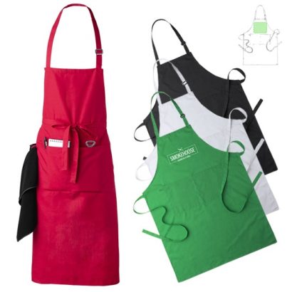 Delantal de alta calidad en material TC -combinado de algodón y poliéster-. En variada gama de vivos colores, con bolsillo doble frontal y cintas de cuello con ajustador. De corte por debajo de la rodilla.