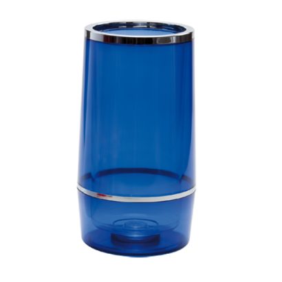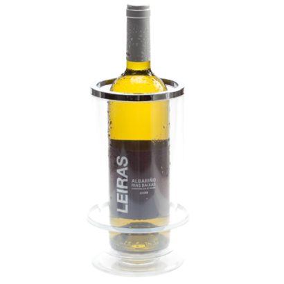 Botellero para botellas de vino de hasta 75 cl en original acabado transparente en variados colores. Con anillas en color plateado brillante y base adaptada para botella. Presentado en caja individual.