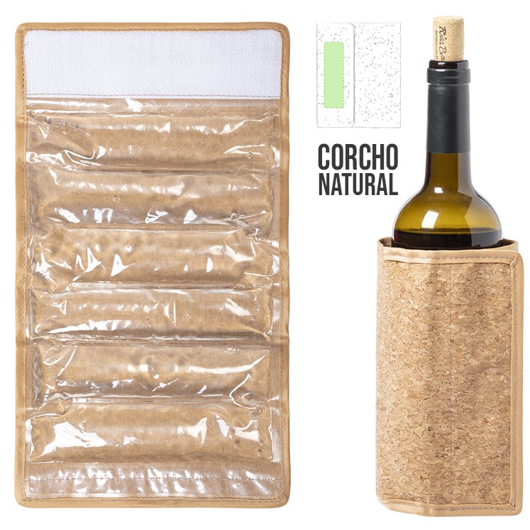 Enfriador de línea nature para botellas, fabricado en resistente corcho natural. Con cierre ajustable de velcro y líquido refrigerante interior.