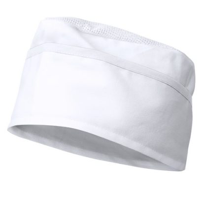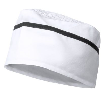 Gorro de cocina en y cómodo material TC -combinado de algodón y poliéster- en alegre combinación de color blanco con accesorios en vivos colores. Ajustable