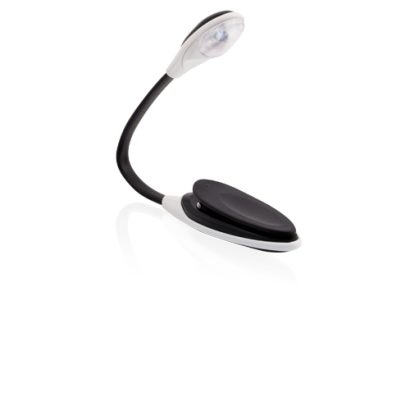 Lámpara led de lectura de diseño bicolor. Con cuerpo flexible y cómoda pinza de sujeción. Presentada en caja individual. 1 Led. Flexible. Pilas Botón Incluidas