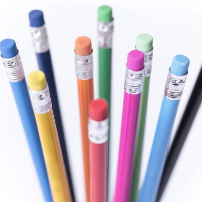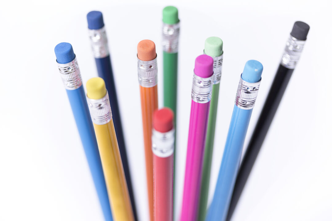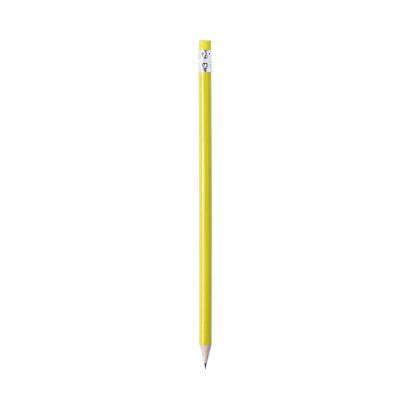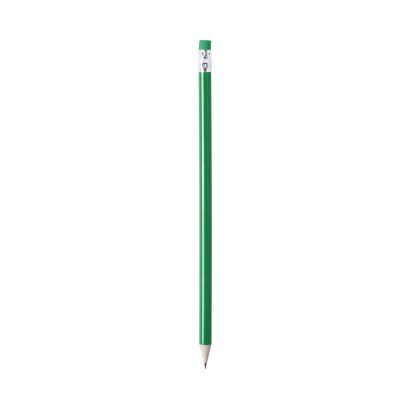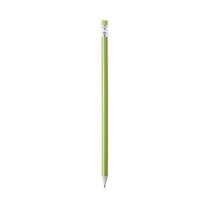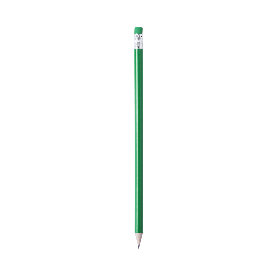 Lápiz de madera con cuerpo redondo en variada gama de colores brillantes y goma de borrar a juego. Punta afilada.