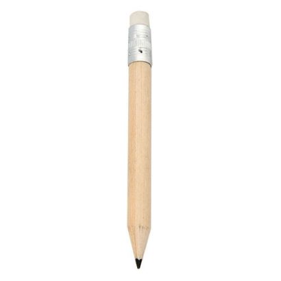 Minilápiz de madera de acabado natural. Con cuerpo redondo y goma de borrar en color blanco. Mina negra y punta afilada.