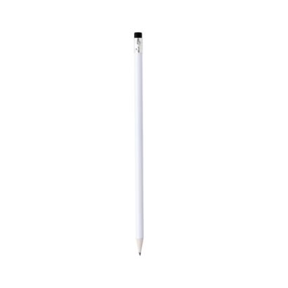 Lápiz de madera en color blanco y de acabado brillo. Con cuerpo redondo y goma de borrar disponible en variada gama de colores. Mina negra y punta sin afilar.