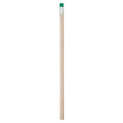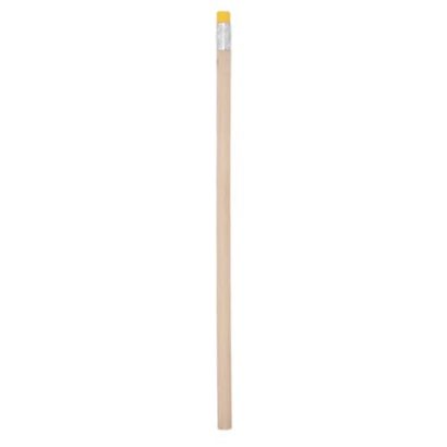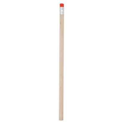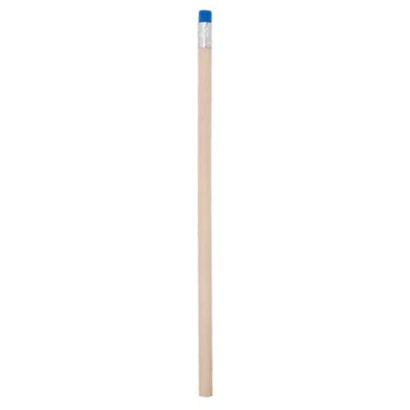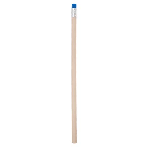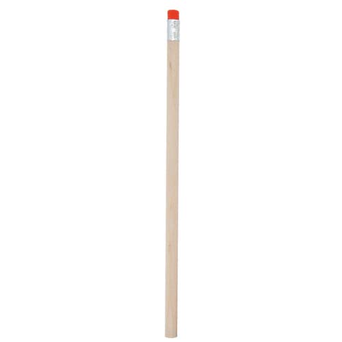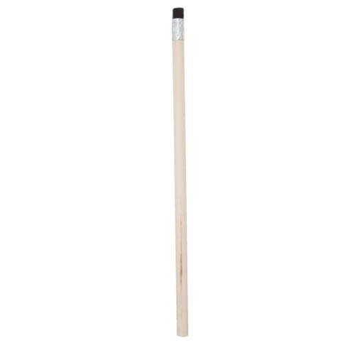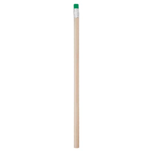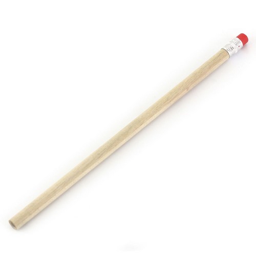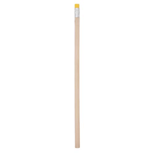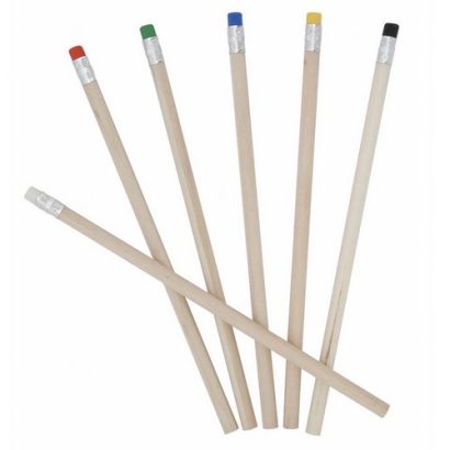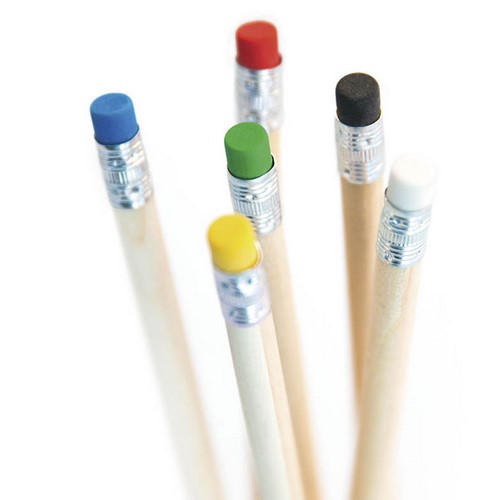 Lápiz de madera de acabado natural. Con cuerpo redondo y goma de borrar -goma disponible en variada gama de colores-. Punta sin afilar.