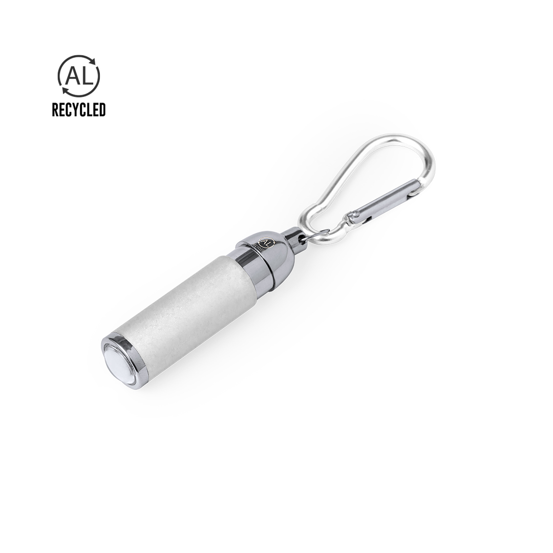 Llavero linterna con cuerpo fabricado en Aluminio Reciclado. Equipado con 1 LED de potencia, funciona con pilas de botón incluidas y cuenta con un enganche en forma de mosquetón del mismo color. Incluye logotipo Aluminio Reciclado en un lateral y está disponible en una variada gama de colores. Presentado en caja de diseño kraft. El Aluminio Reciclado es un material con posibilidades de reciclaje casi infinitas, sin perder sus propiedades originales y consumiendo menos energía en este proceso. Certificación GRS (Global Recycled Standard / Estándar de Reciclaje Global), que garantiza el origen reciclado del material usado para fabricar el producto. 1 Led. Pilas Botón Incluidas