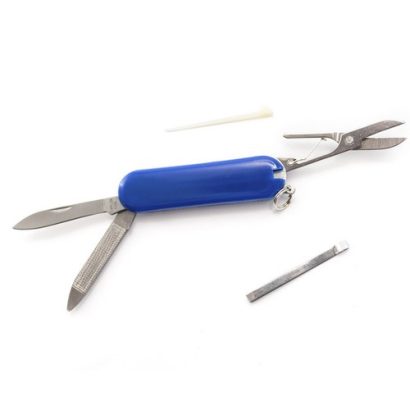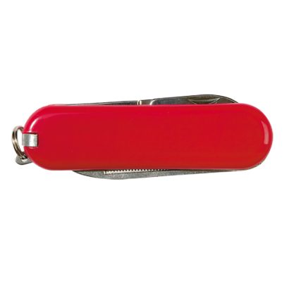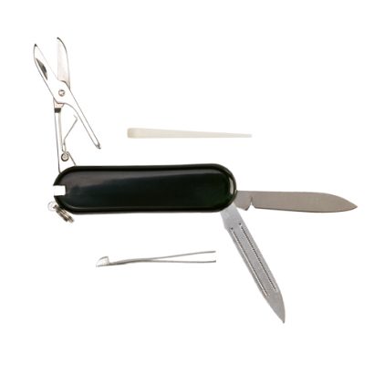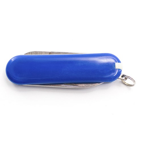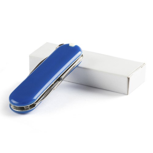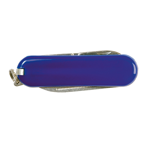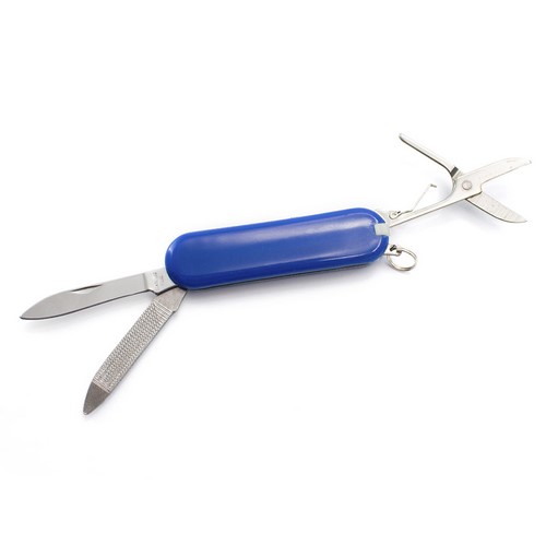 Mininavaja multiusos con accesorios de acero inox, de 6 funciones en variados colores. Incluye navajas, pinzas, lima, palillo, anilla para llavero y tijeras. Presentada en caja individual. 6 Funciones