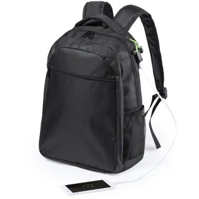 Mochila de resistente poliéster 600D en elegante acabado impermeable de color negro y salida para auriculares. Con compartimento interior con salida USB para conexión de powerbank -no incluido-. Interior con compartimento acolchado para ordenador portátil de hasta 15 pulgadas y tablets de hasta 10 pulgadas. Multitud de bolsillos interiores y exteriores. Cintas de hombros y espalda con acolchado ergonómico. Conexión USB. Bolsillo Acolchado para Portátil y Tablet. Parte Trasera y Cintas Acolchadas